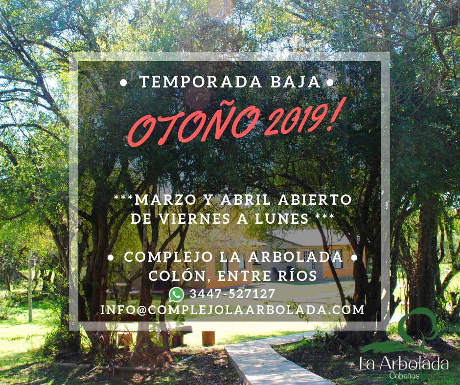 Otoño 2019 por admin | Mar 4, 2025 | General, Promociones Durante marzo y abril el complejo permanecerá abierto de viernes a lunes (excepto Semana Santa). Consultá promociones por 2 días/1 noche y por 3 días/ noches en cabañas y domos.
