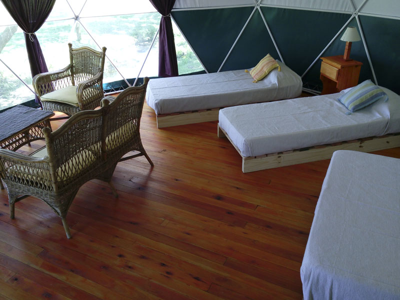 Los DOMOS cuentan con una cama de 2 plazas (colchón de alta densidad, Cannon) más dos camas de una plaza (Cannon). Juego de sillones. Mesa con banquetas.